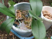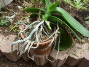 鉢から根が出てきて窮屈になったもので、水を与えても内部によく浸透するものは、鉢増しという一回り大きな鉢に植え替えればよいのですが、根が詰まると水を与えても根全体に水分が行き渡らなくなり通気も悪く、花が咲かなくなってきます。酷くなったら水苔など全ての用土を交換します。植え替え周期は種類によって異なるのですが、通常は2年から3年ぐらいです。植え替えの時期は新芽の吹く春に植え替えます。