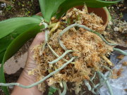 | 水苔で植えられた根鉢の壊し方(コチョウラン) | ||