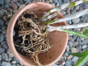 鉢の底に水に濡らして絞った水苔を入れてやや押し固めておきます。鉢から飛び出た根で、根鉢に入りそうにない根や腐った根があれば切り取ります。腐った根は指でつまむと潰れるので分かると思います。株を手にとって根の底に水苔を詰めて、少しずつ水苔を足して根の周辺を固めながら団子のようにします。団子のようにした根鉢を鉢の中に入れ、隙間に濡らして絞った水苔をやや硬めに詰めます。詰める際は根を痛めないよう注意します。